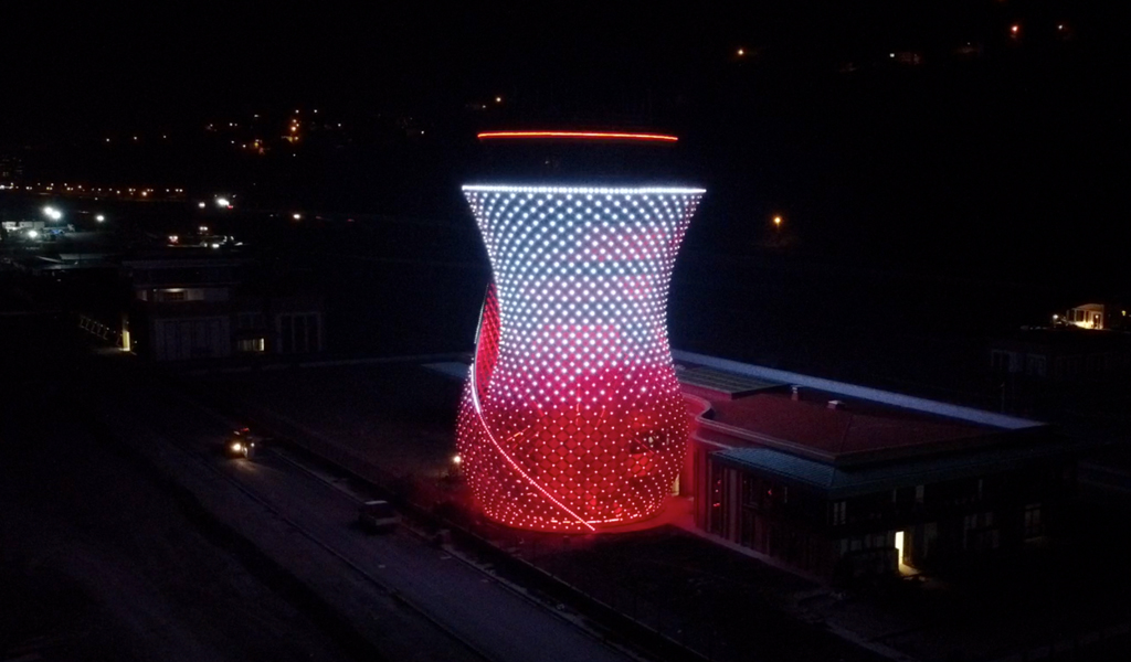 As HeraLED, we inspired by the history and traditions of the eastern Black Sea region, used local colors and animations suitable for this unique architecture, and put our signature under a perfect facade lighting. By taking advantage of our one-of-a-kind new product, Chronopix, we added a new dimension to the architecture of the iconic tea glass design air traffic control tower. Since we can use the color of the case whatever we want in Chronopix, we associate our product with the color of the material used in the construction of the tower, making the tower sparkle at night, and integrating our product with the building in order not to get in the way of the architecture during the day. We continue the magnificent light show every night with different colors and animations that are unique to the region also suitable for tea glass design.